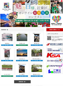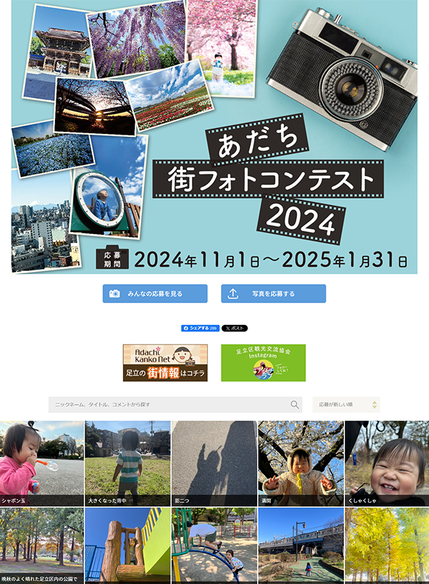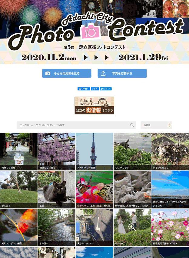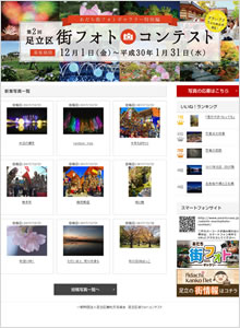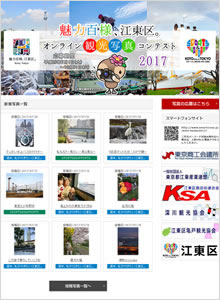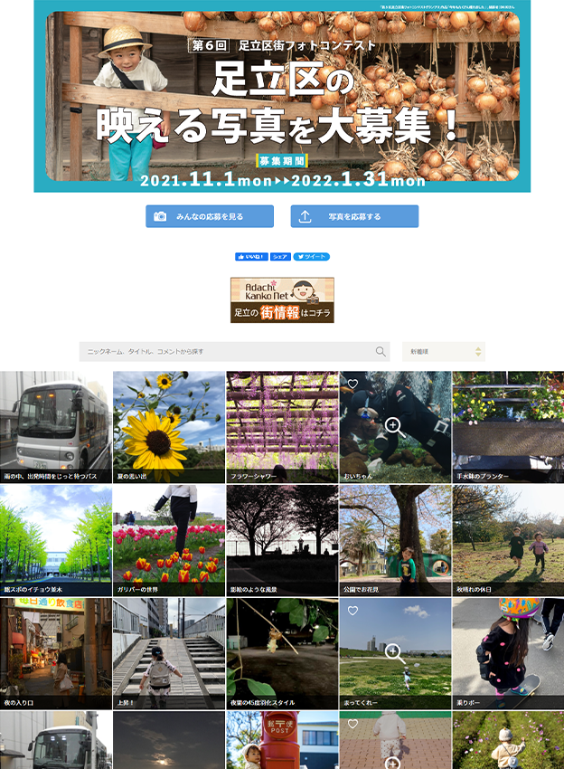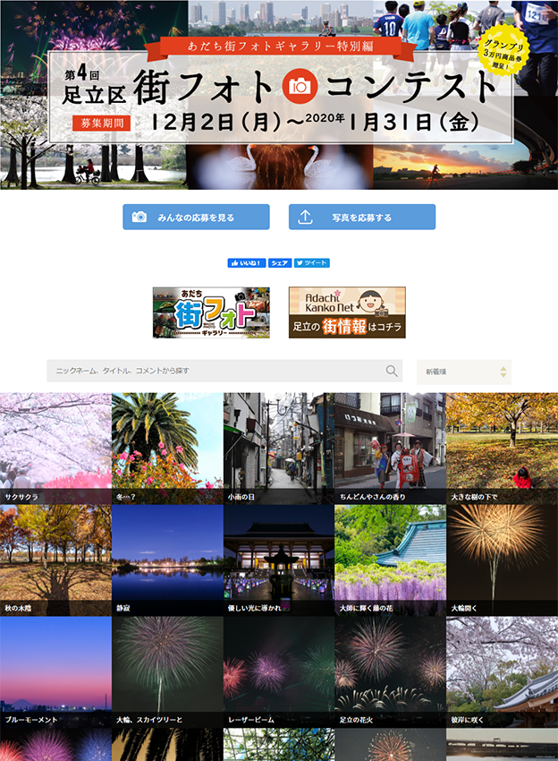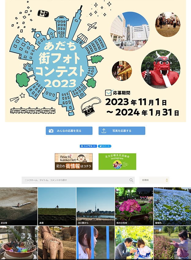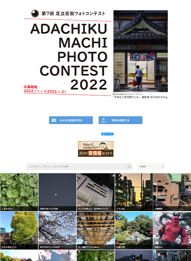 足立区観光交流協会様 - 足立区で撮影された魅力的な風景を募集するフォトコンテストです。応募作品は区のPR素材としてポスターやHPなどに活用され、観光協会のHPには実際にどのような媒体で使われたかを掲載しています。年間契約のライトプランをリピートでご導入いただいております!