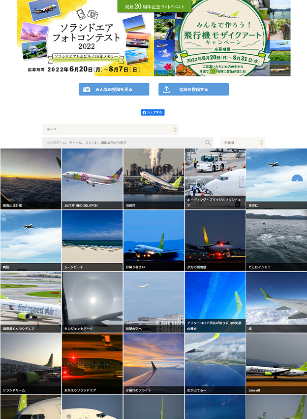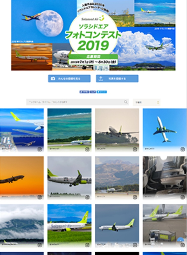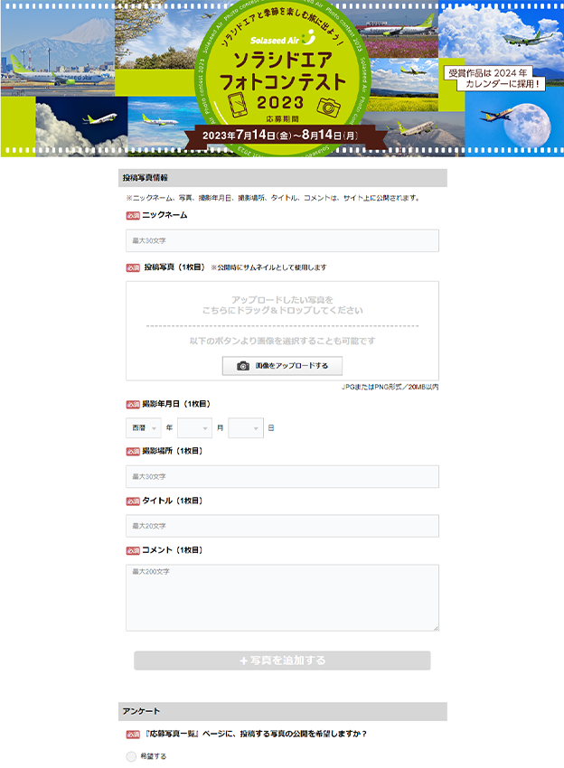 株式会社ソラシドエア様 - 航空機の写真を対象にしたフォトコンテストです。応募フォームでは写真添付や作品タイトルの他、撮影場所や撮影年月日等の項目を追加し写真情報として取得されました。写真は一度に5枚まで応募頂けます。