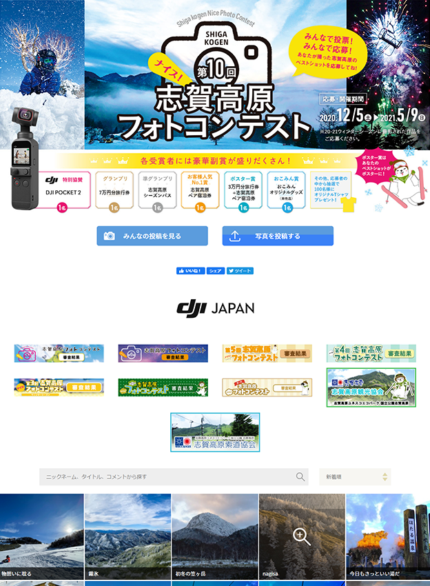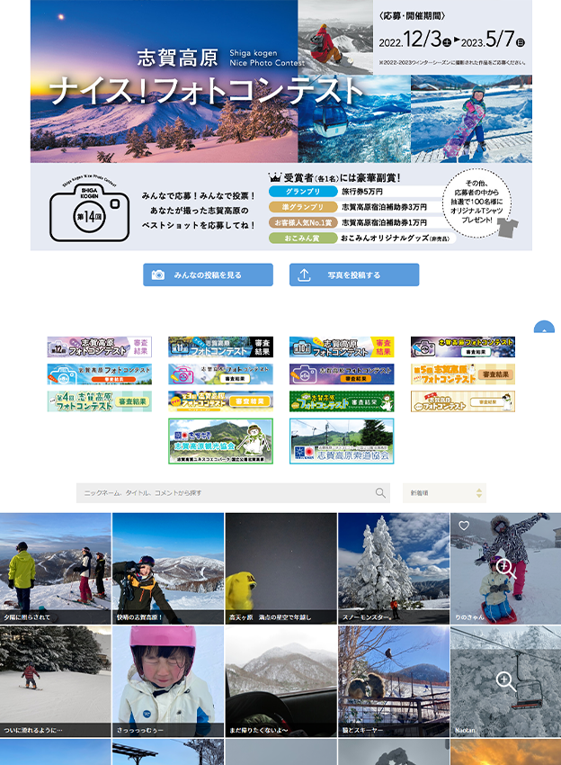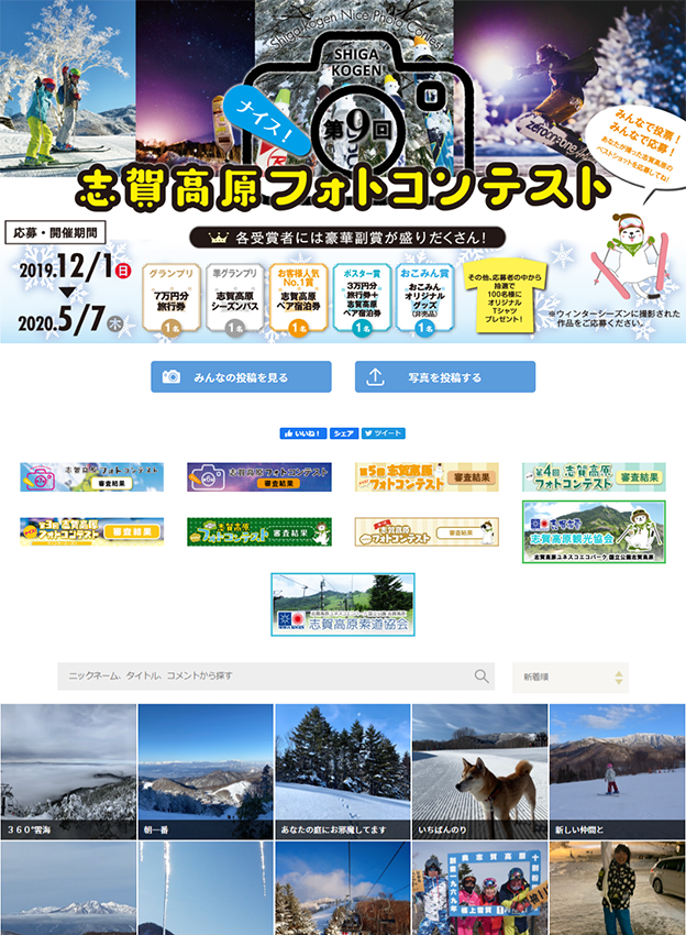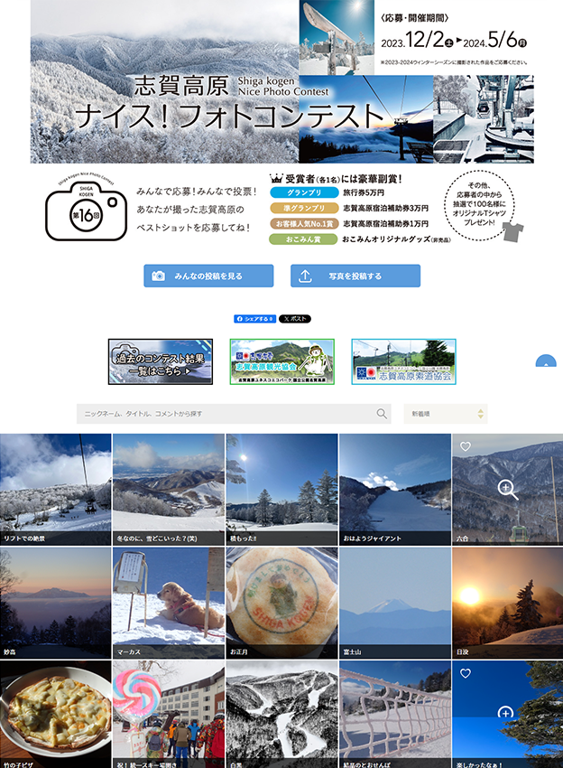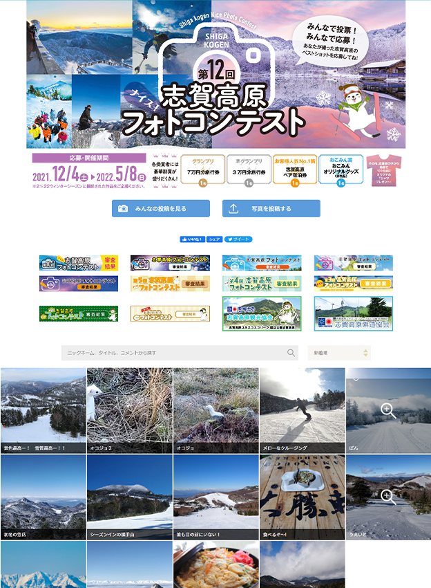 志賀高原観光協会様 - ウィンターシーズンに志賀高原で撮影された写真を対象としたフォトコンテストです。賞品もご用意されており、旅行券や志賀高原の宿泊補助券等が貰える各賞の他に、応募者には抽選でオリジナルTシャツが贈られます。旅行の記念にぴったりです。
