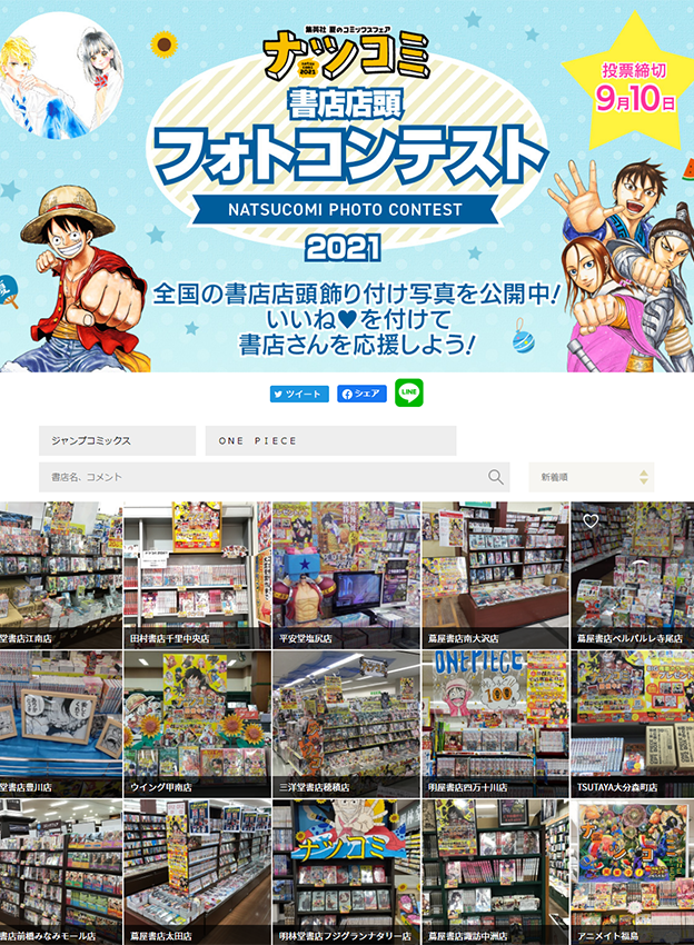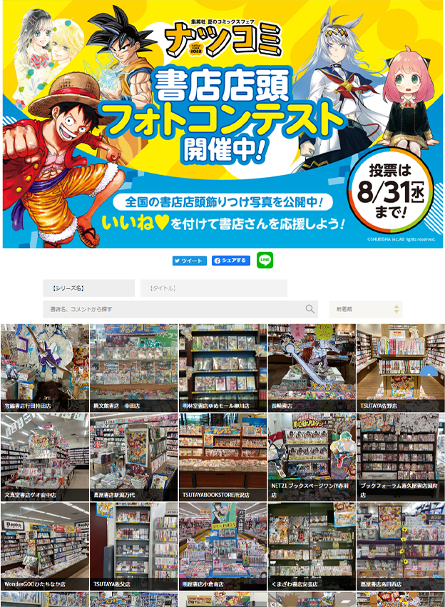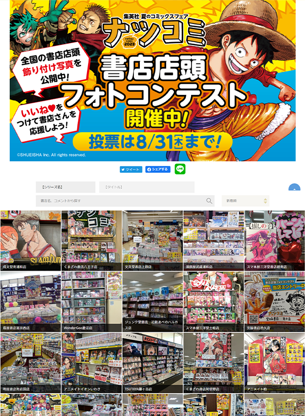 株式会社集英社様 - 毎年恒例の夏のコミックスフェア「ナツコミ」を盛り上げる施策として、全国の書店にて店頭ディスプレイの様子を募集するフォトコンテストが開催されました。