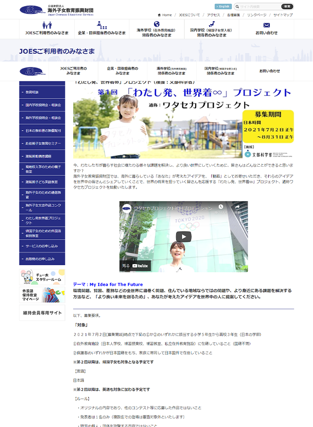 海外子女教育振興財団様 - 海外に暮らしている学生を対象にされたアイディア動画を投稿いただくご企画です。環境問題や貧困、差別などの世界に渦巻く問題の解決方法がテーマとされており、より良い未来を創るための3分~4分程度のスピーチ動画をシェアしていただくご企画です。