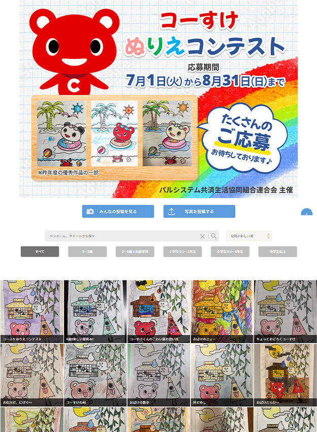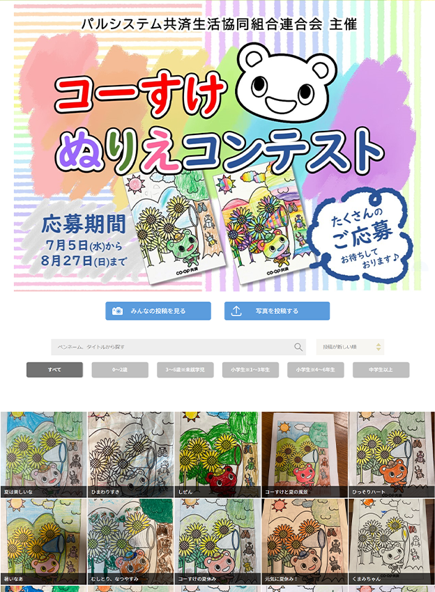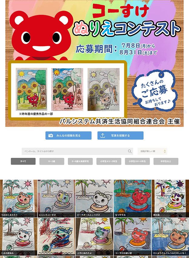 連合会様 - コープ共済のキャラクター“コーすけ”をモチーフにした塗り絵のフォトコンテストです。ギャラリーページでは全ての写真だけでなく、年代区分を選択すると選択した年代のみの写真が表示される仕様です。