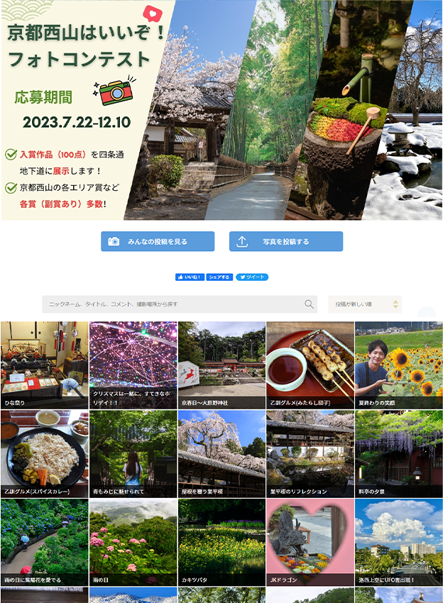 京都市西京区様 - 4つの市町村を対象エリアにしたフォトコンテストです。昨年に引き続き年間契約をご継続でリピート実施頂きました。オプションでアンケート項目や複数枚応募機能を追加しています。