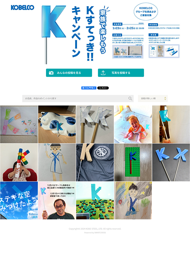 株式会社神戸製鋼所様 - 神戸製鋼の企業キャラクターが持っている「Kすてっき」をテーマにした施策で、お子様などが自作した「Kすてっき」の写真や絵などを投稿頂くフォトコンテストが開催されました。従業員様とそのご家族様向けの社内キャンペーンです。