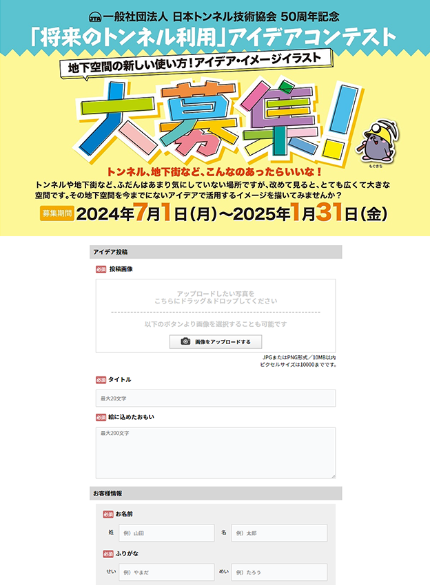 日本トンネル技術協会様 - 日本トンネル技術協会50周年記念で開催された「地下空間の新しい使い方」をテーマにしたアイデアコンテストで弊社フォトコンテストシステムをご導入いただきました。全国の小・中学生が対象です。