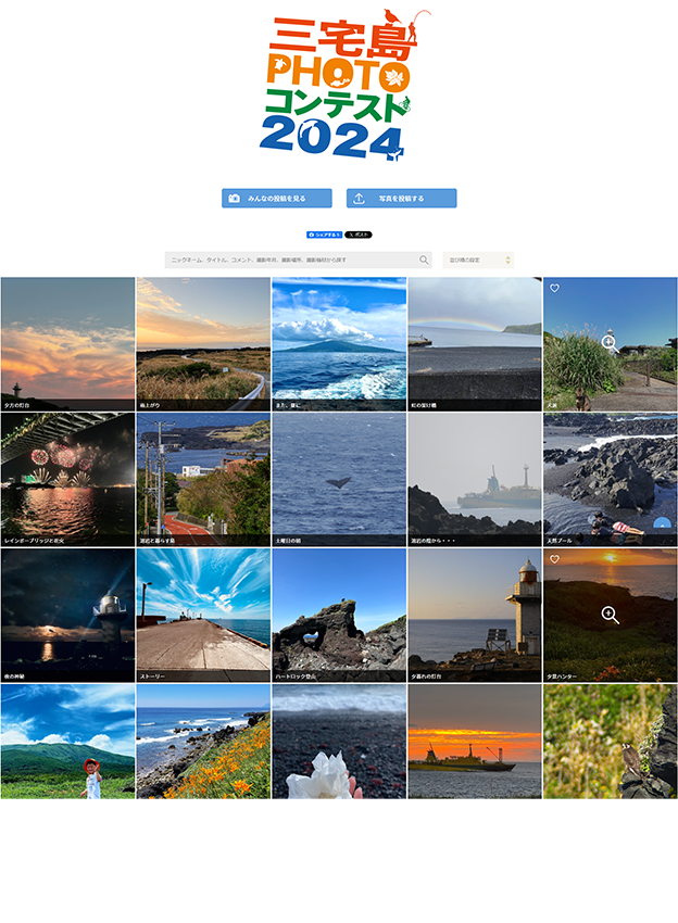 三宅島観光協会様 - 募集テーマは「三宅島の魅力を捉えており、三宅島のPRとなる写真」です。作品へのいいね機能をご活用いただいており、審査員審査に加え、いいね数が多く集まった作品を選ぶ一般審査の2つの審査方法で入選作品を選出されています。