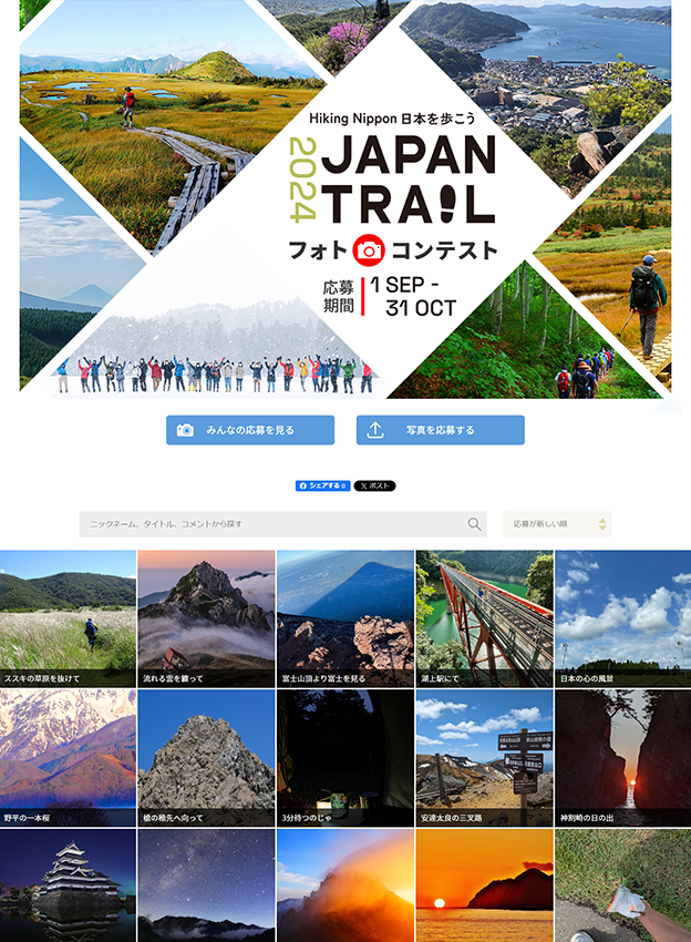 日本ロングトレイル協会様 - 全国各地のトレイルが対象のフォトコンテストです。写真投稿のシステムだけでなくLPと結果発表ページの制作も弊社で担当しており、LP制作~投稿受付~結果発表まで一貫してお任せ頂きました。