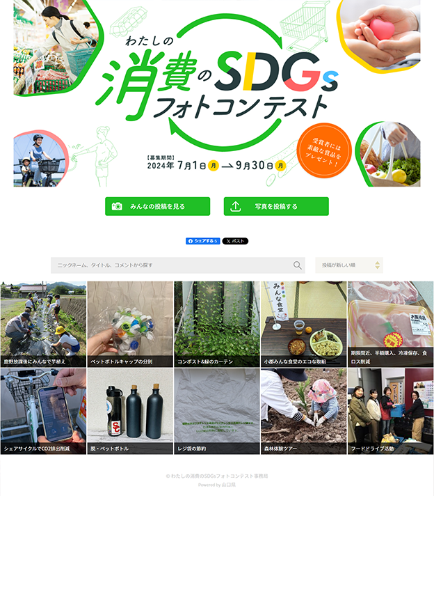 山口県様 - 山口県主催のSDGsに関するフォトコンテストに弊社システムをご導入頂きました。普段のお買い物やライフスタイルから見つけた「わたしの消費のSDGs」のテーマに沿った写真を投稿して頂く企画です。