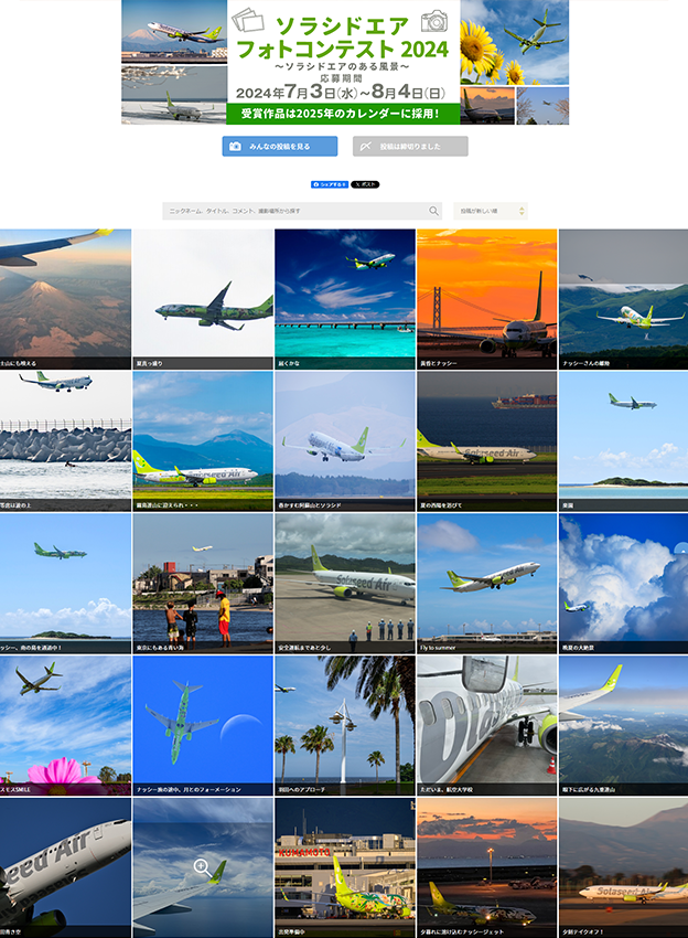 株式会社ソラシドエア様 - 航空機の写真を対象にしたフォトコンテストです。応募フォームでは写真添付や作品タイトルの他、撮影場所や撮影年月日等の項目を追加し写真情報として取得されました。写真は一度に5枚まで応募頂けます。
