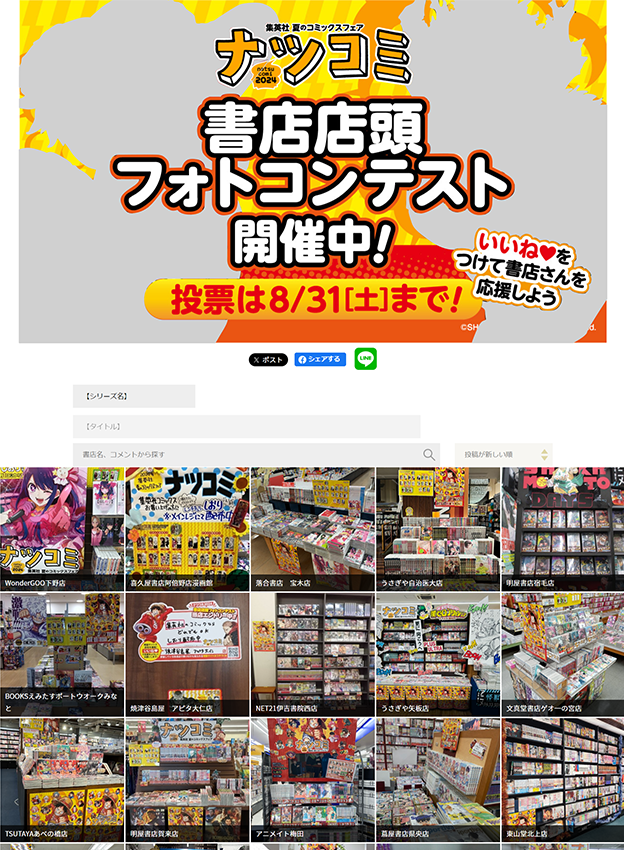 株式会社集英社様 - 毎年恒例の夏のコミックスフェア「ナツコミ」を盛り上げる施策として、全国の書店にて店頭ディスプレイの様子を募集するフォトコンテストが開催されました。