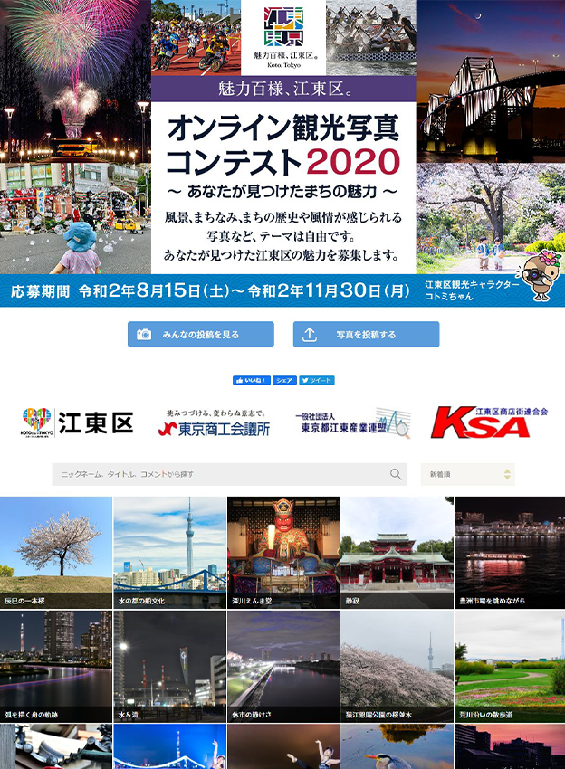 足立区観光交流協会様 - 足立区で撮影された魅力的な風景を募集するフォトコンテストです。応募作品は区のPR素材としてポスターやHPなどに活用され、観光協会のHPには実際にどのような媒体で使われたかを掲載しています。年間契約のライトプランをリピートでご導入いただいております!