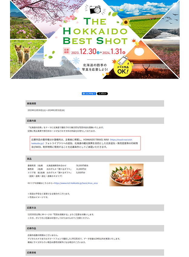 北海道観光復興機構様 - 「北海道の四季」をテーマに北海道で撮影された魅力的な写真作品を募集するフォトコンテストが開催されました。低コストで気軽にコンテストの立ち上げが可能なライトプランにてご導入いただきました。入賞者には北海道の海鮮グルメが贈られます。