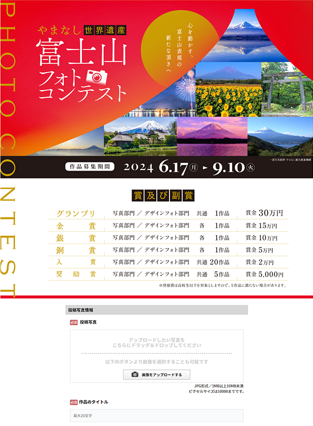 山梨県様 - 「あなたがみんなに見せたい富士山」をコンセプトとしたフォトコンテストです。撮影した写真を投稿する写真部門と、撮影した写真をベースにアレンジしたデザインフォト部門の二つの部門を設けられています。