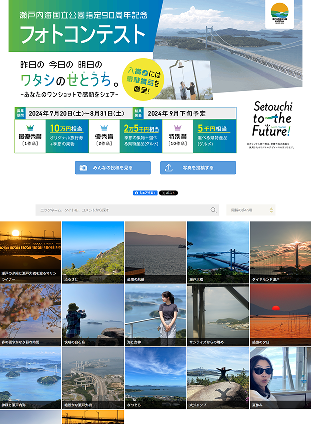 岡山県様 - 岡山県内にある瀬戸内海国立公園の国立公園指定90周年を記念したフォトコンテストです。システムだけでなく、終了後の結果発表ページの制作も弊社にお任せ頂きました!