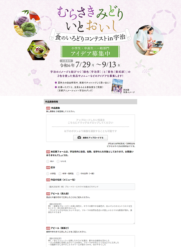 宇治市様 - 宇治のイメージと結びつく緑色と紫色の2色を使った食品やメニューのアイデアを募集するコンテストです。市内の小学生、中高校生、一般部門の応募フォームとしてご利用頂きました。