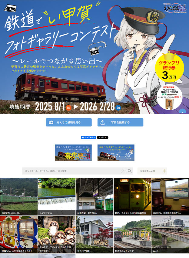 甲賀市観光まちづくり協会様 - 滋賀県甲賀市の鉄道や風景をテーマにしたフォトコンテストです。 年間でご導入いただき、毎月「今月の1枚」として入賞作品を公表されています。 ギャラリーページにはLPと「今月の1枚」のページへのバナーを設置しています。