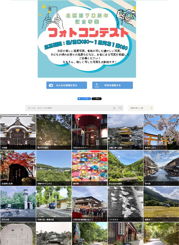 京都市西京区様 - 4つの市町村を対象エリアにしたフォトコンテストです。昨年に引き続き年間契約をご継続でリピート実施頂きました。オプションでアンケート項目や複数枚応募機能を追加しています。